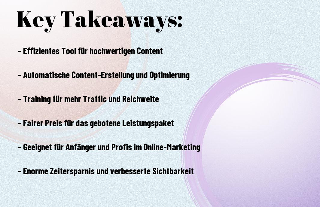 Nach eingehender Analyse und persönlichen Erfahrungen kann ich mit Überzeugung sagen, dass der „Content König 2.0“ von Torsten Jaeger eine äußerst effiziente Lösung zur automatisierten Erstellung hochwertiger und SEO-freundlicher Inhalte bietet. Dank seiner benutzerfreundlichen Oberfläche und vielseitigen Anwendungsmöglichkeiten eignet sich dieses System sowohl für Anfänger als auch für erfahrene Content-Ersteller. Mit einem fairen Preis-Leistungs-Verhältnis und zusätzlichen Boni wie dem Traffic und Reichweiten Videokurs bietet der „Content König 2.0“ einen spürbaren Mehrwert für jede Online-Präsenz. Durch seine automatisierte Funktion können Zeitersparnis und verbesserte Sichtbarkeit erzielt werden, was die Effektivität des Online-Marketings nachhaltig steigert. Hier am Workshop teilnehmen und zum vergünstigten Preis sichern!